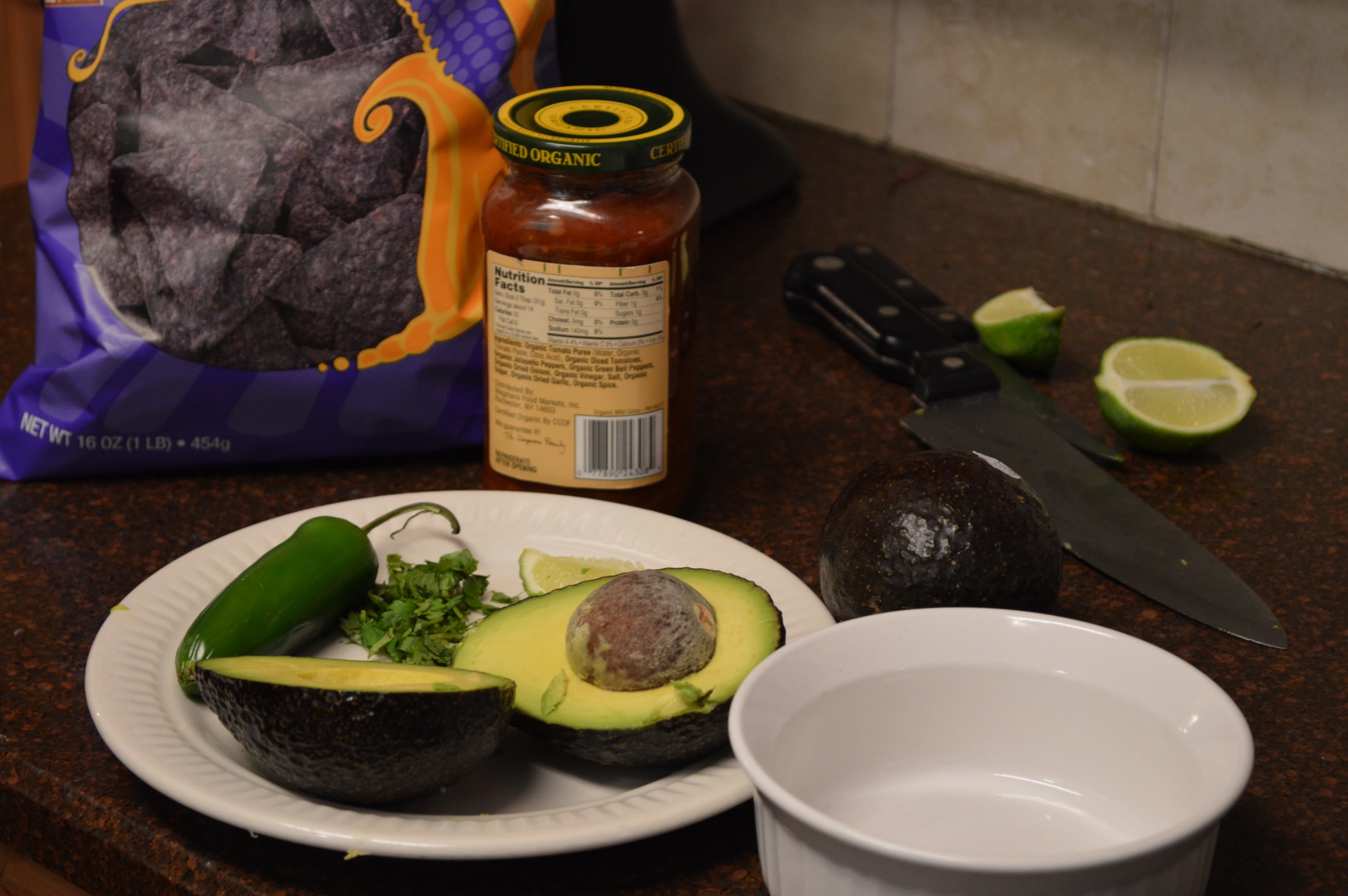 For snack we had blue corn chips with guacamole and salsa. There isn’t a store brought guacamole I like, so I always make my own. Keeping with the laziness of my day, I didn’t feel like doing all the chopping so I took some shortcuts. I mashed the avocado with a tablespoons of chopped fresh cilantro, a bit of jalapeno pepper, a squirt of lime juice, and a couple of heaping tablespoons of ready made salsa. It was really good, and it carried us over until I felt like getting dinner ready.
