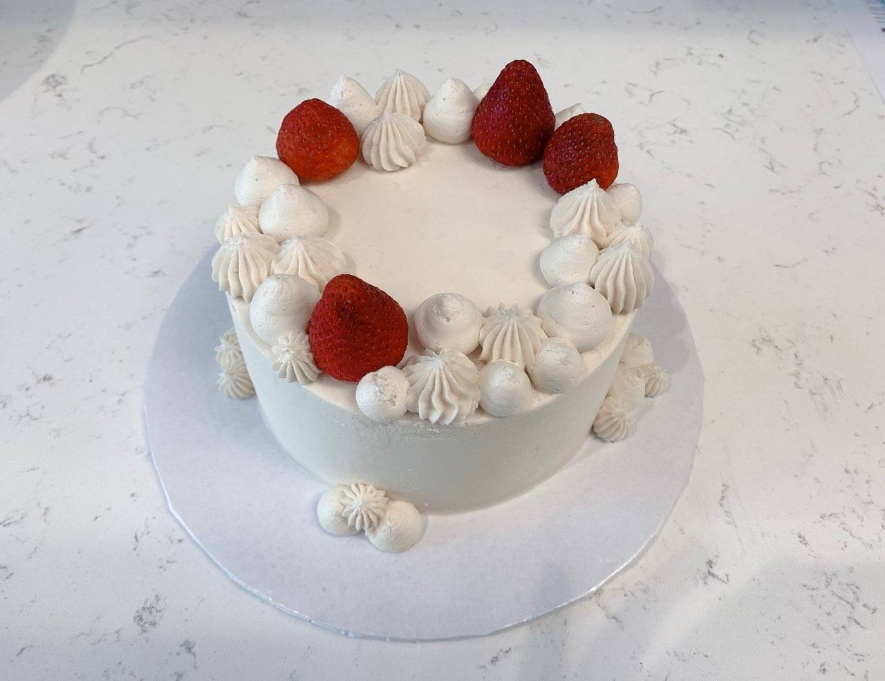 3-layers of vanilla cake and alternating layers of Strawberry Preserves, Fresh strawberry, and Vanilla Bean Crème filling, the outside of the cake is iced in vanilla frosting. Gluten-free optional.