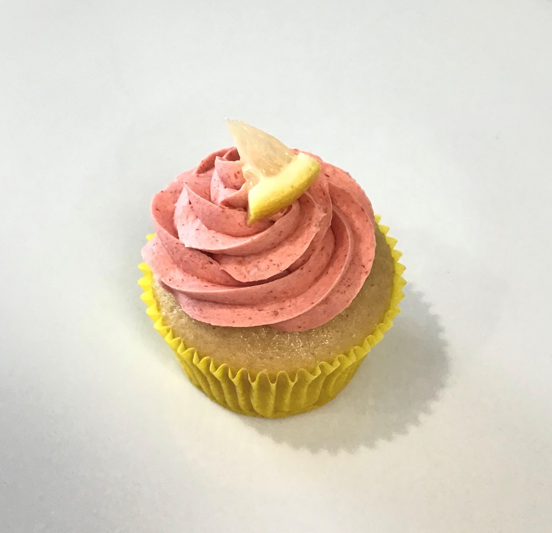 Our Vegan Strawberry Lemonade Cupcakes consists of lemon cake, filled with strawberry preserves, topped with strawberry frosting.